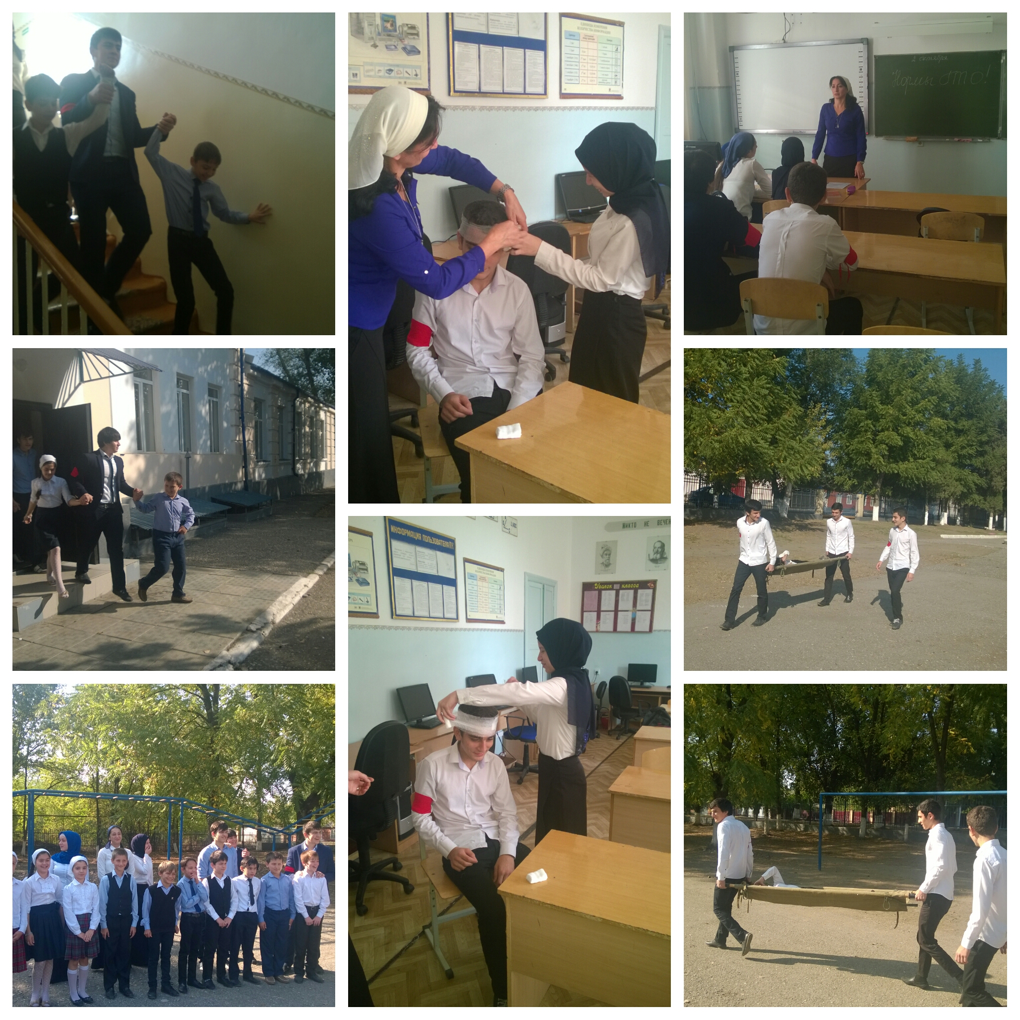 Мероприятия проводились в кабинете и на свежем воздухе. Были показаны учащимся приемы правильного наложения повязок при травмах. Продемонстрированы приемы эвакуации при чрезвычайных ситуациях. Рассказали о возможности спасать подручными средствами пострадавших
